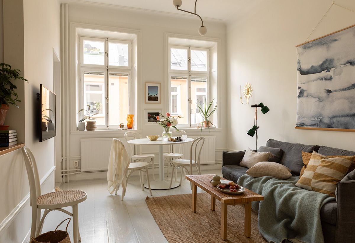 Почти все поверхности в этой небольшой двухкомнатной квартире площадью 31 кв. м в Стокгольме белые: пол, стены, потолки, кухонные шкафчики, плитка в ванной. Развеселить и оживить интерьер были призваны тёмно-синие акценты, навивающие морские нотки и добавляющие свежести пространствам. Спальня здесь совсем маленькая, зато с окном и небольшим книжным шкафом, а также атмосферной тёмной стеной. Отличный вариант лёгкого оформления небольшого жилья!