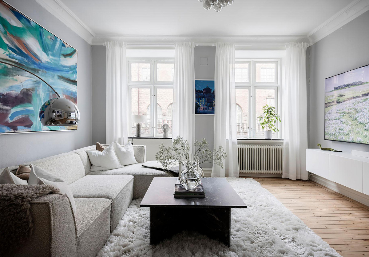В этом скандинавском интерьере много белого цвета: диван с подушками, ковёр, шторы, корпусная мебель и не только. Стены в комнатах имеют лёгкий, еле заметный пастельно-серый оттенок, который также приближен к белому. Зато на настенном декоре дизайнеры, что называется, «отыгрались по-настоящему». Современное искусство, постеры и фотографии в рамках привнесли цвет и радость в этот почти монохромный интерьер. Enjoy!