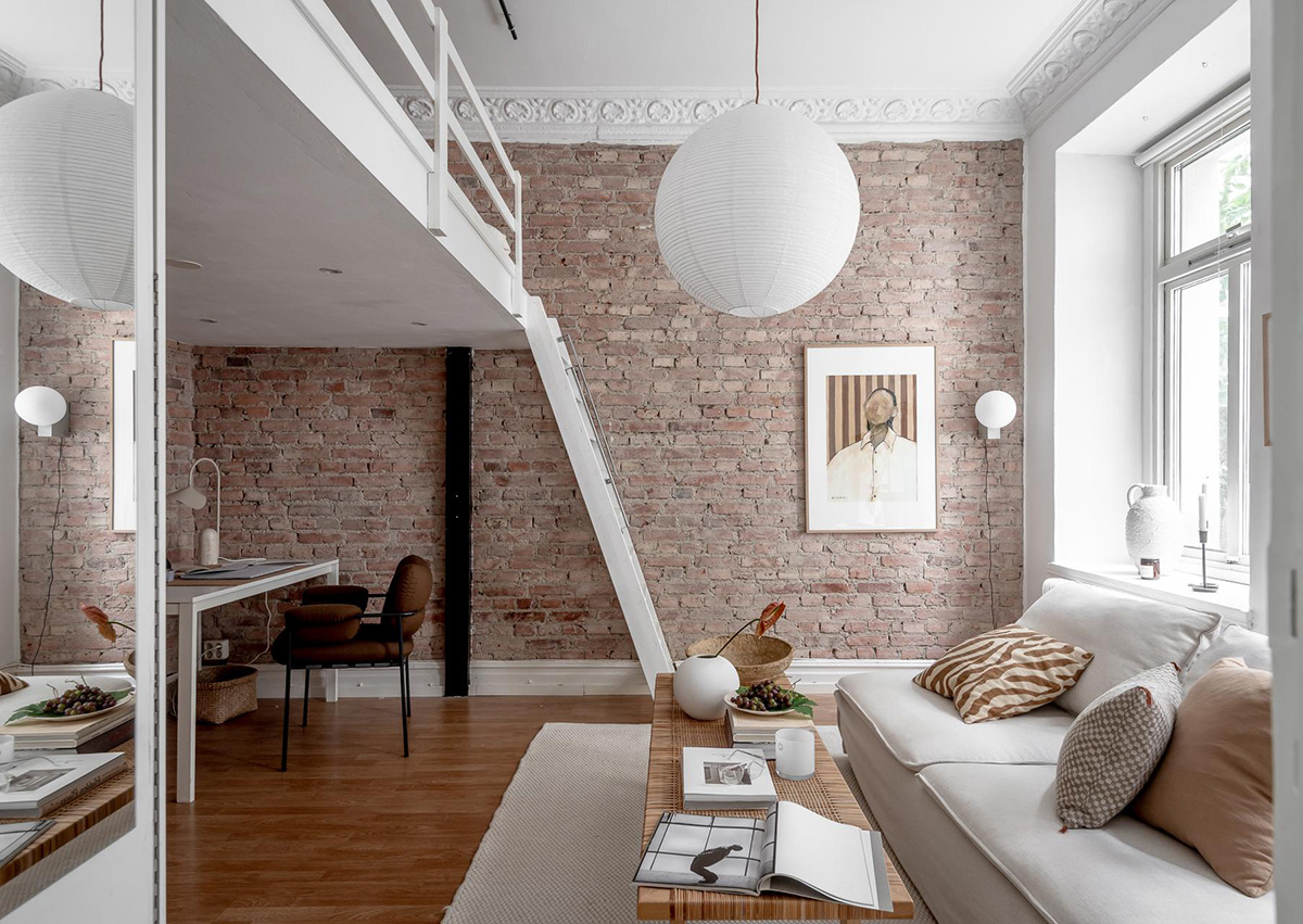 Маленькая, но с характером — эта квартира в Швеции площадью всего 35 кв. м подкупает своими выразительными декоративными элементами и интересными решениями. Дизайн её интерьеров построен на контрастном сочетании белого декора и открытых кирпичных стен, которые придают эффектности любому интерьеру. Высокие потолки с лепниной пришлись здесь очень даже кстати — дизайнеры спроектировали антресоль со спальней и офисным уголком под ней. Отличный проект оформления небольшого жилья!