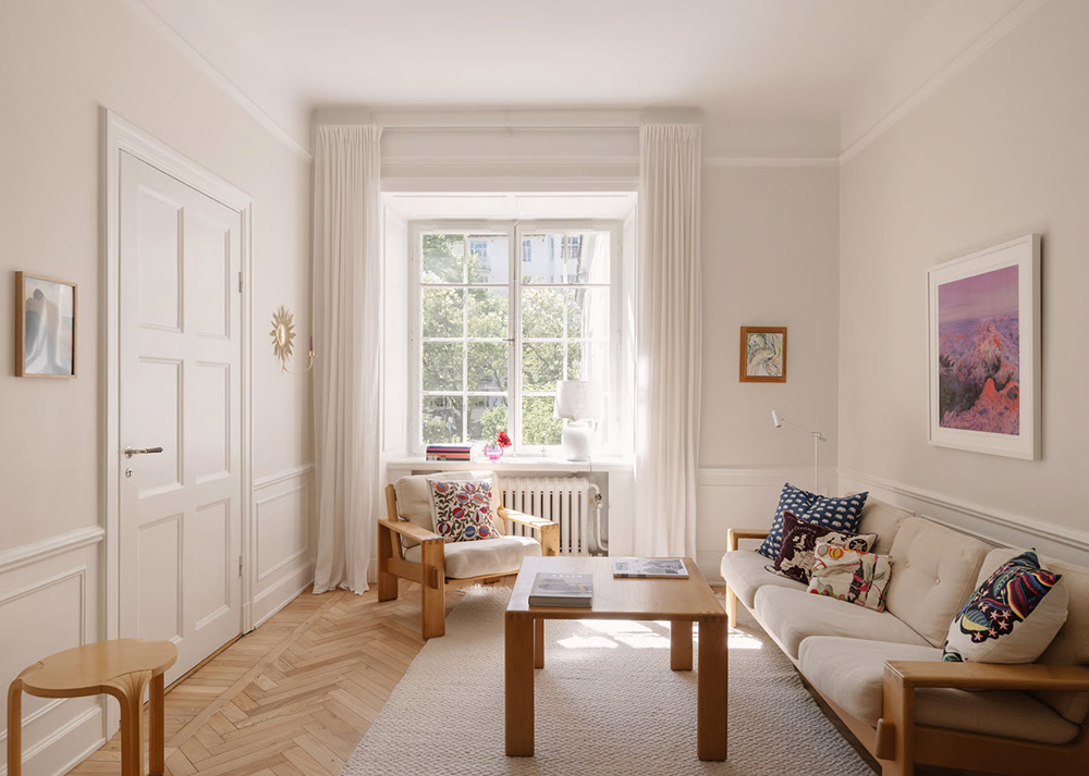 Не будучи слишком ярким или выразительным, интерьер этой небольшой квартиры в Стокгольме вызывает только самые приятные и тёплые эмоции. Здесь сошлись несколько факторов — это и обилие солнечного света, красиво проходящего через великолепные классические окна, и приятный скандинавский декор в светло-молочных тонах, и красивые пространства с высокими потолками и молдингами. Одним словом, мило и уютно!