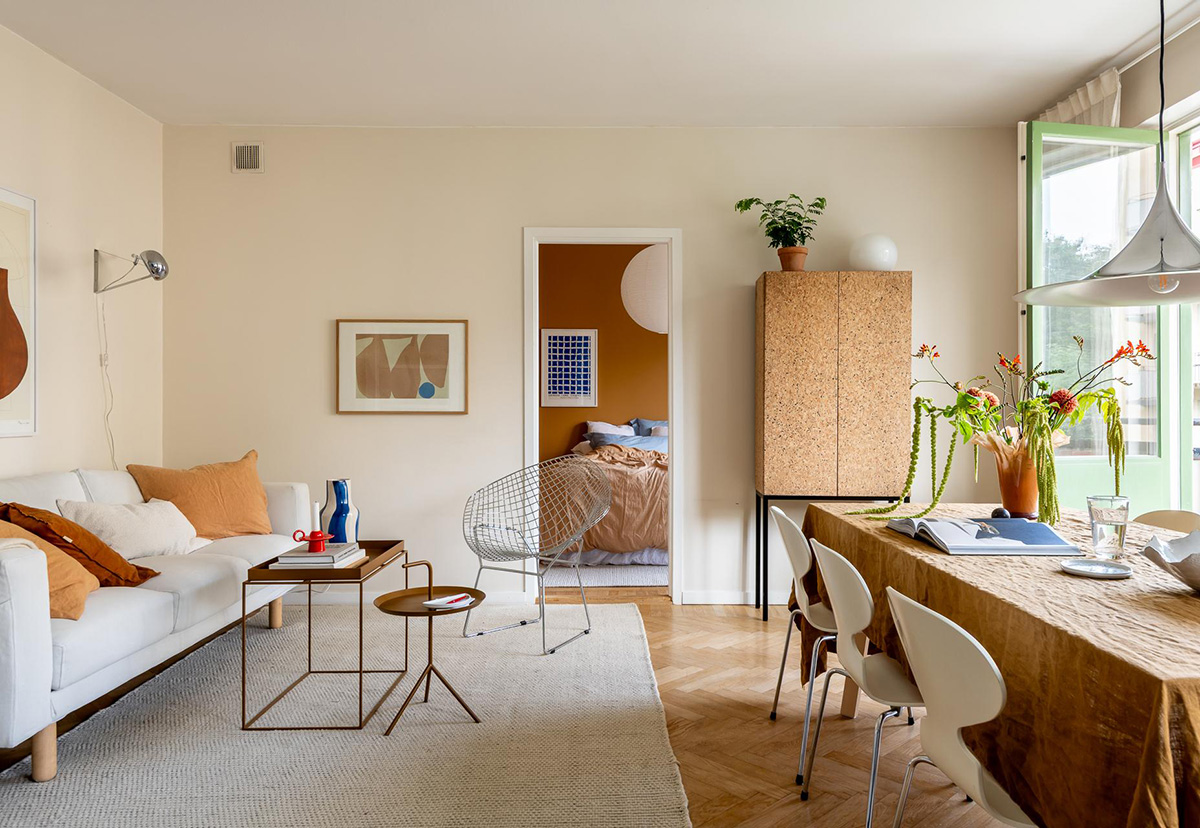 Белый цвет и тёплые акценты — формула успеха этого небольшого шведского интерьера раскрыта! Но нужно отметить, что оттенки подобраны интересные и небанальные. Так, стены в спально покрашены в тёплый терракотовый оттенок, а текстиль в гостиной отлично поддержал эту тему. А ещё благодаря открытой планировке квартира кажется просторной, чем есть на самом деле. Отличный интерьер с цветовой изюминкой!